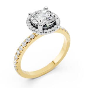 La forma del gambo, lineare e classica, รจ creata a mano in oro bianco e oro giallo 18 karati (oro 750) che, impreziosita dai numerosi diamanti, lo rende un modello di anello da fidanzamento perfetto da abbinare ad una fede matrimoniale.