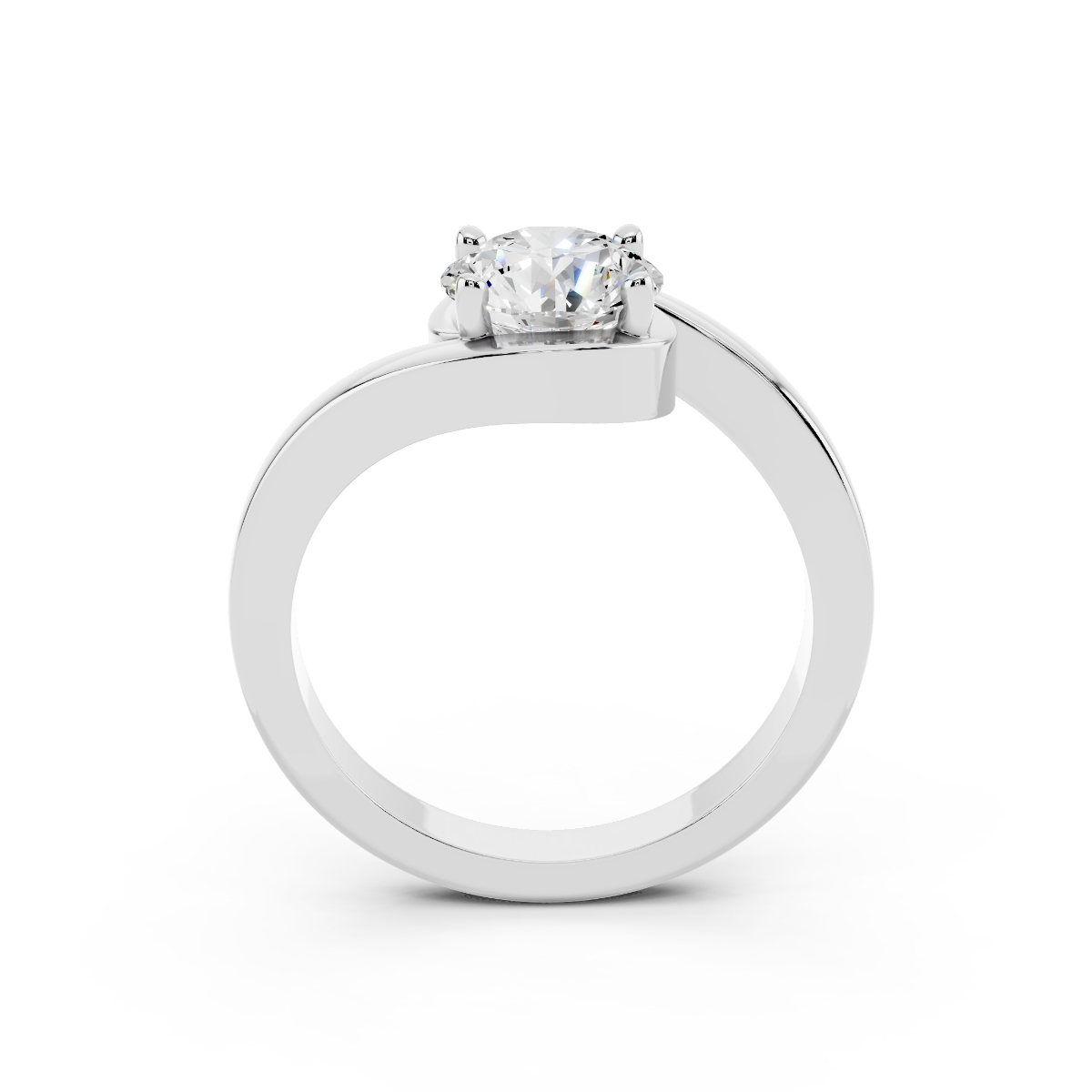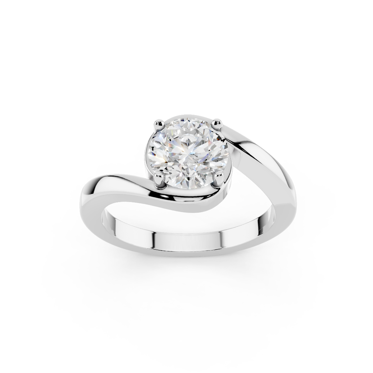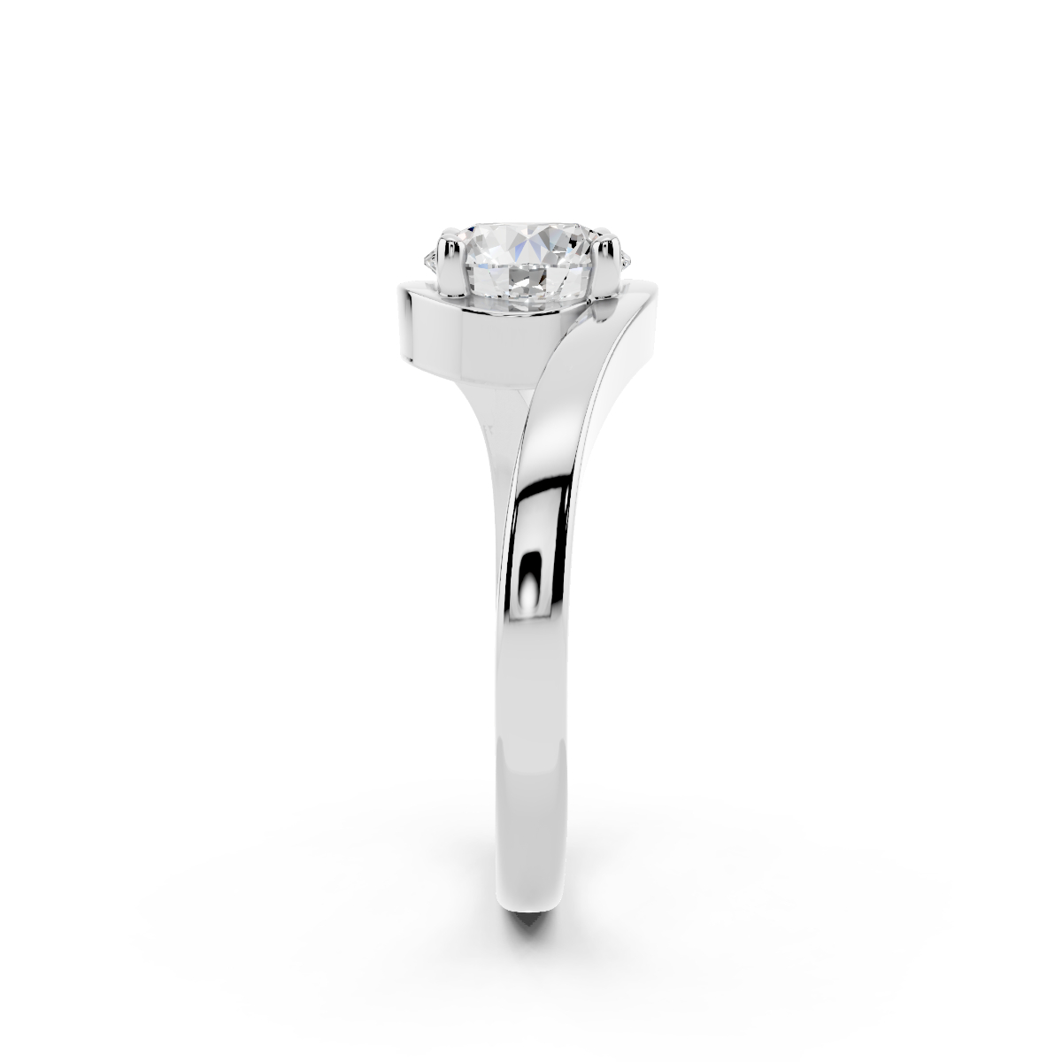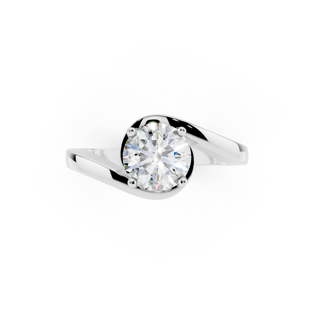 Modello di anello con diamante solitario singolo con il castone che lo avvolge con un movimento di “abbraccio” creato a mano artigianalmente in oro italiano 750 (oro bianco 18 karati..).