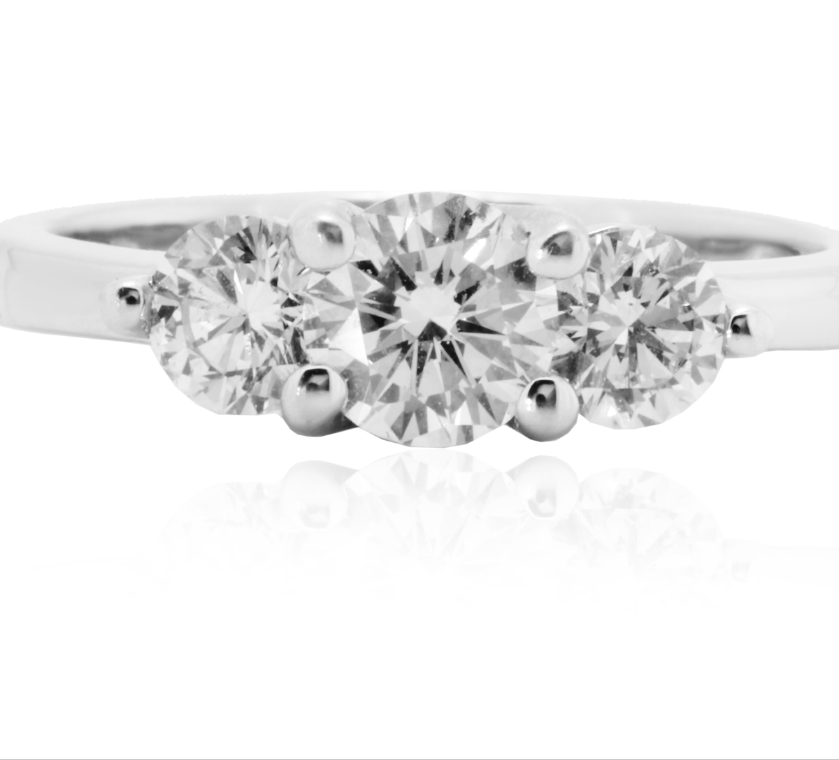 Trilogy in oro bianco 18 karati con 3 diamanti taglio brillante colore F purezza IF (E’ la purezza massima) i 3 diamanti hanno una caratura totale di 1 carato (Diamante centrale di 0,50 carati e i laterali di 0,25 carati l’uno)