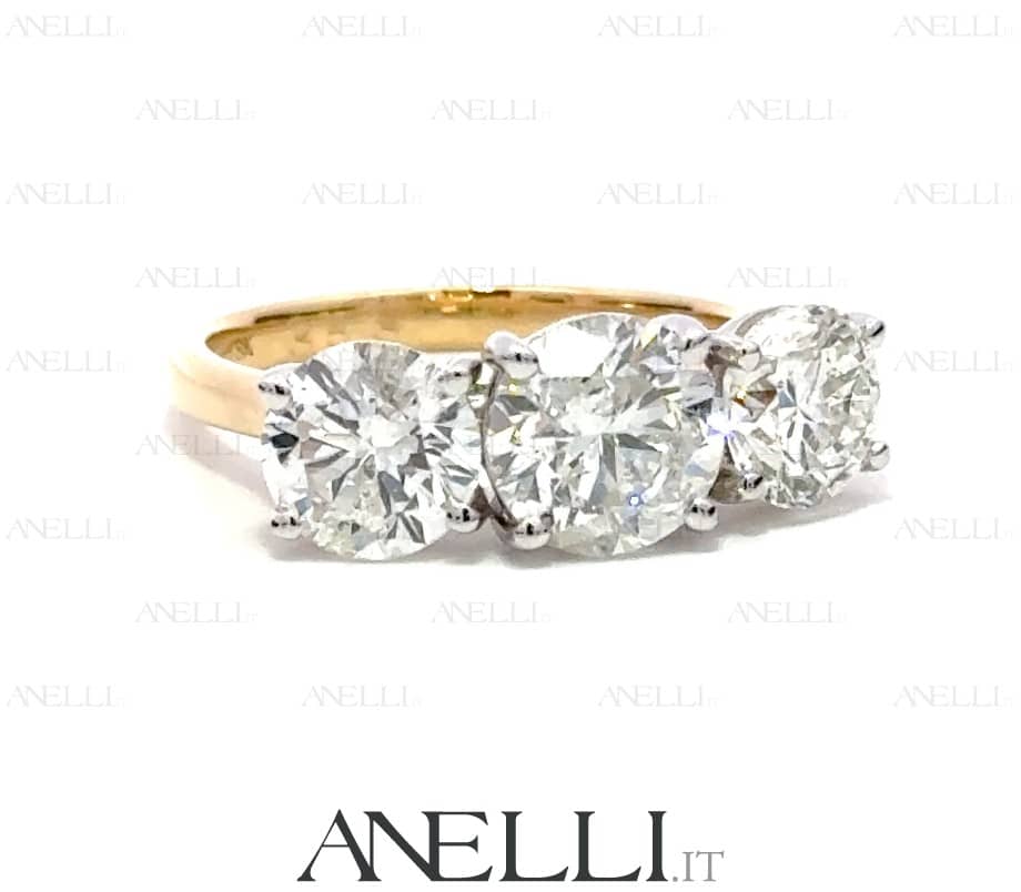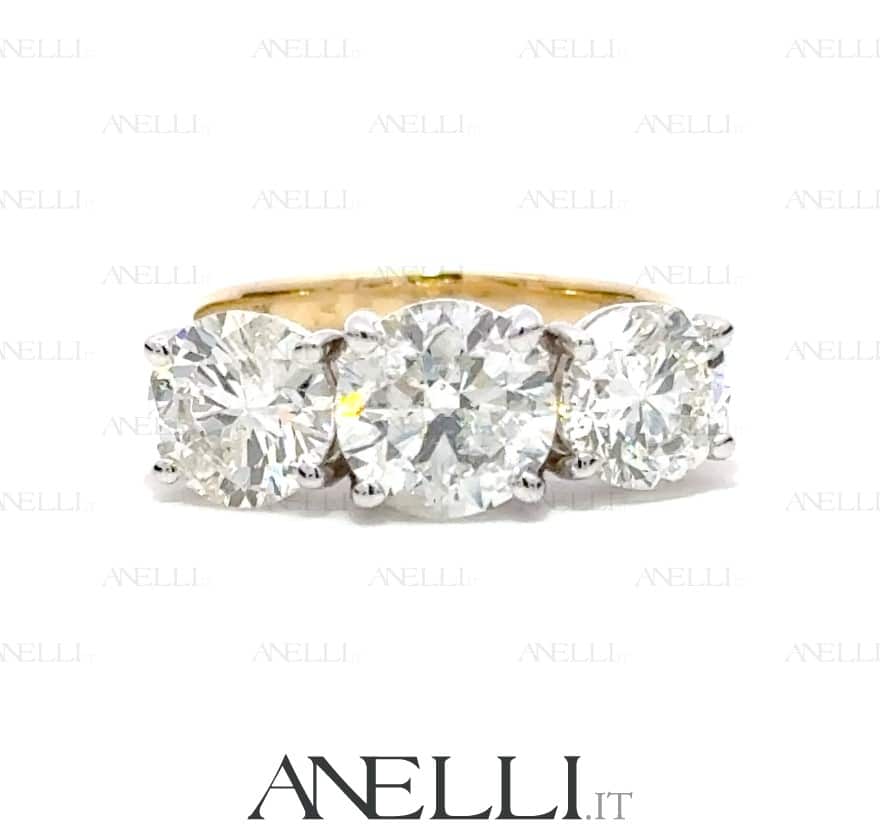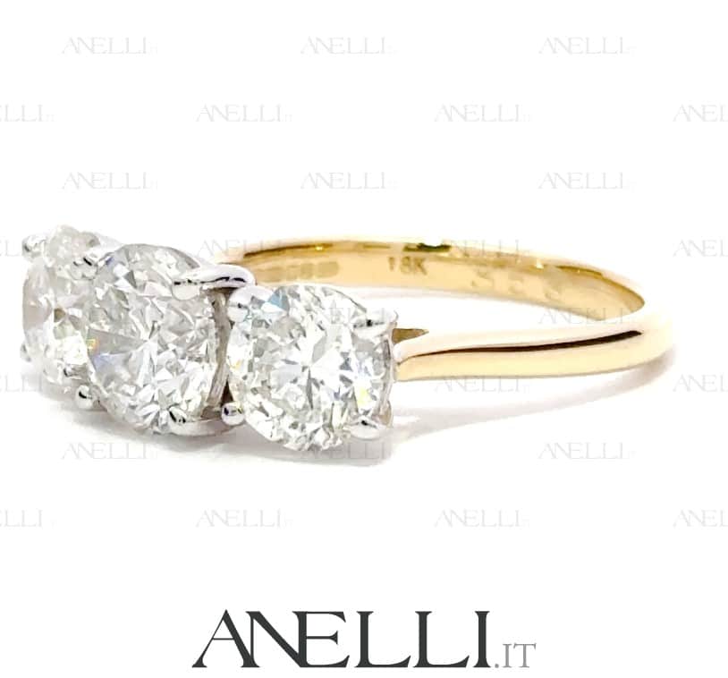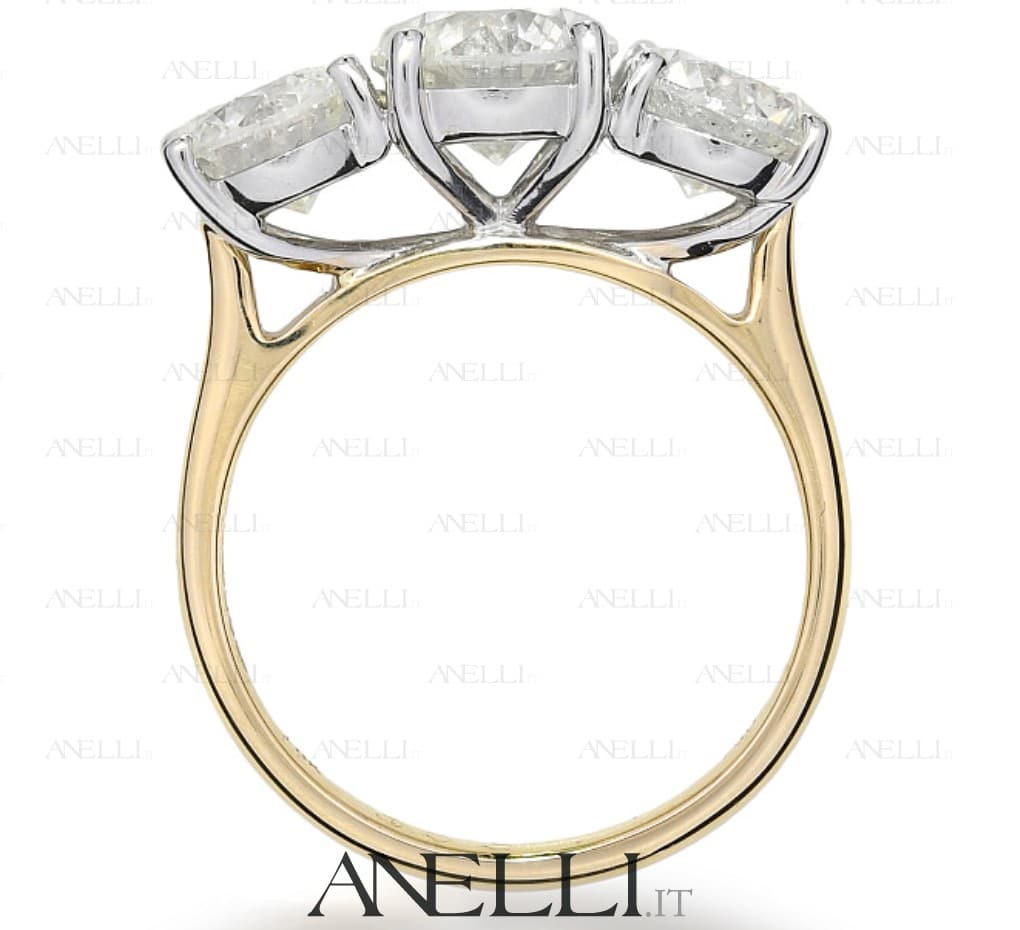 Tre diamanti taglio brillante: il diamante centrale da 1.50 carati (un carato e mezzo) + due laterali da 1 carato l’uno, sviluppando l’importante caratura finale di 3.50 Carati.