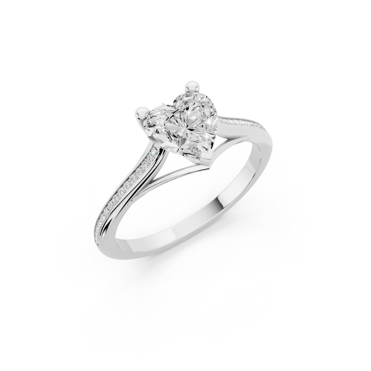 Diamante naturale taglio a cuore di 1 carato + 0.20 carati di diamanti laterali che sviluppano l’importante caratura finale di 1.20 carati.