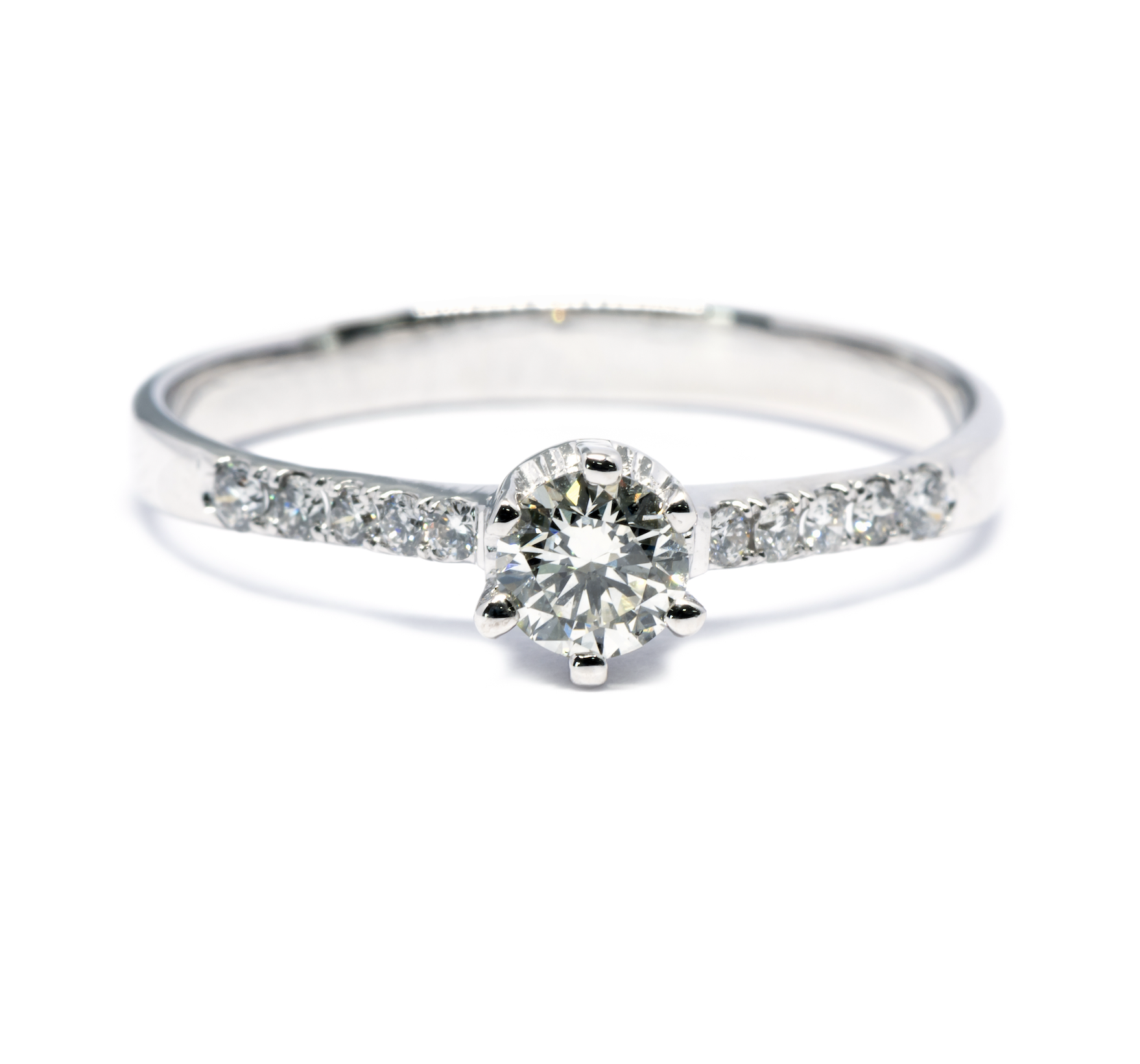 Anello di fidanzamento con diamante solitario centrale e diamanti laterali.