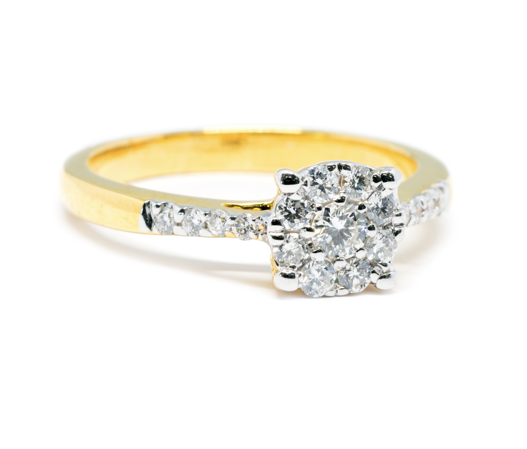 Creato interamente a mano in Oro giallo 18 karati (Oro giallo italiano 750) con incastonati a regola d’arte 0.50 carati totali di diamanti (il diamante centrale è di 0.25 carati) con caratteristiche tecniche di altissima qualità: colore F purezza VVS1