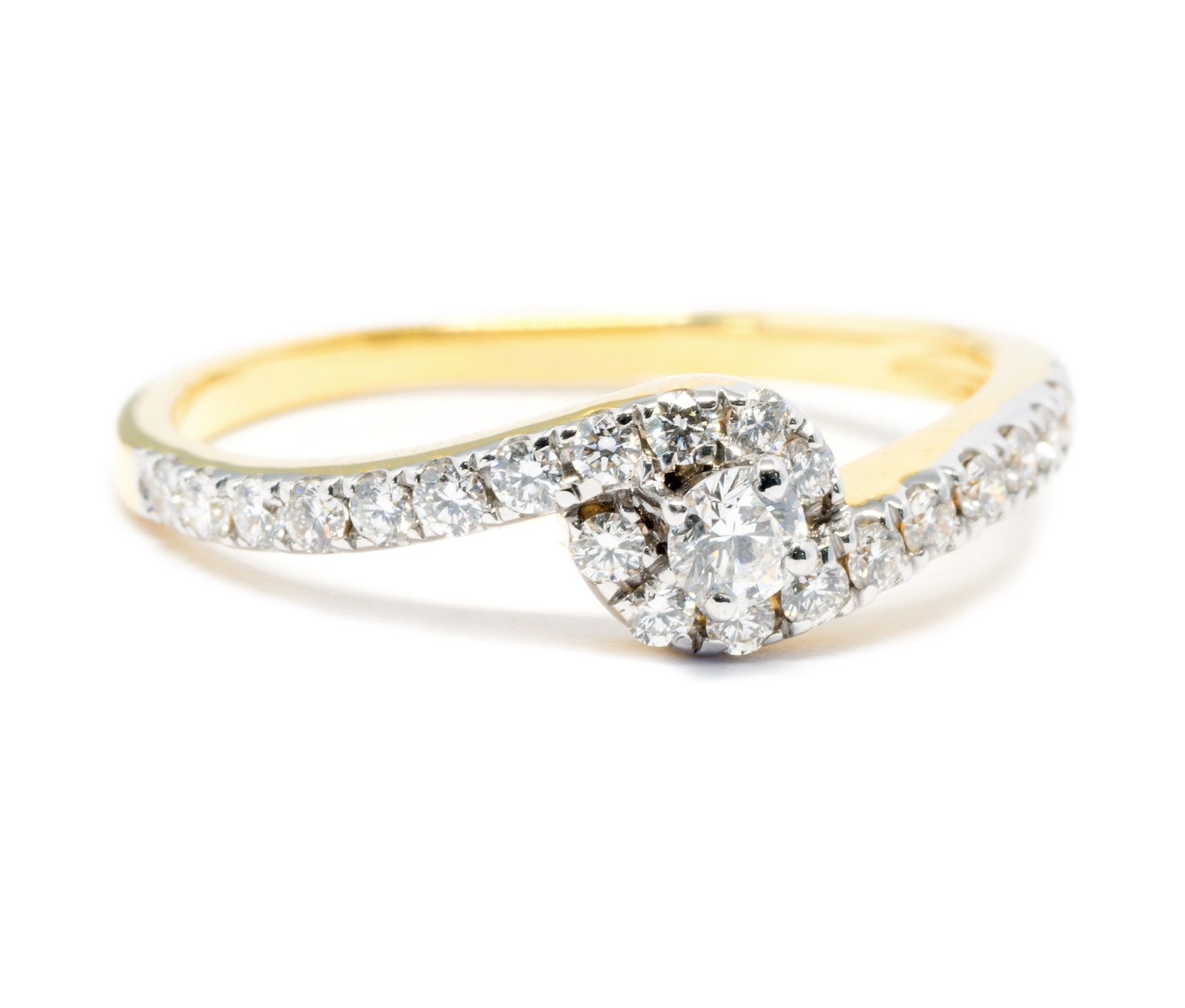Oro giallo 18kt (Oro giallo italiano 750) che vede incastonati a regola d’arte 0.45 carati totali di diamanti (diamante centrale di 0.20 carati) con caratteristiche tecniche di altissima qualitร : colore F purezza VVS1
