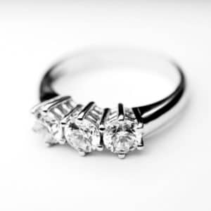 Trilogy di diamanti purissimi, con diamante centrale di mezzo carato più due laterali da 0.25 carati l’uno.