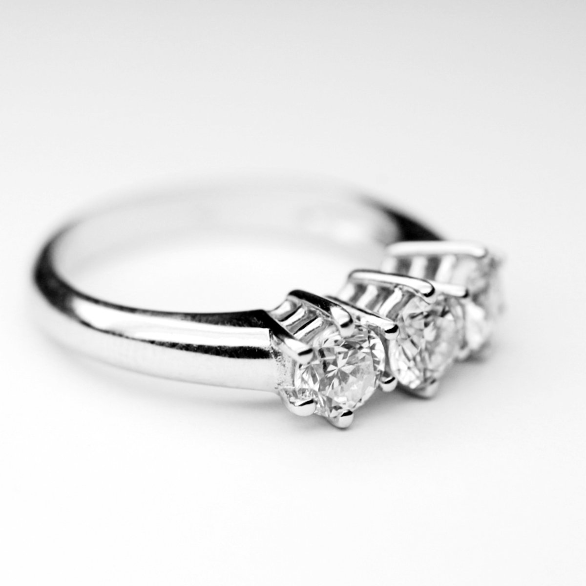 Anello Trilogy Classico con struttura in Oro Bianco 18 karati (Oro 750) e 3 diamanti di 0.30 carati l’uno, che sviluppano la caratura complessiva di 0.90 carati.
