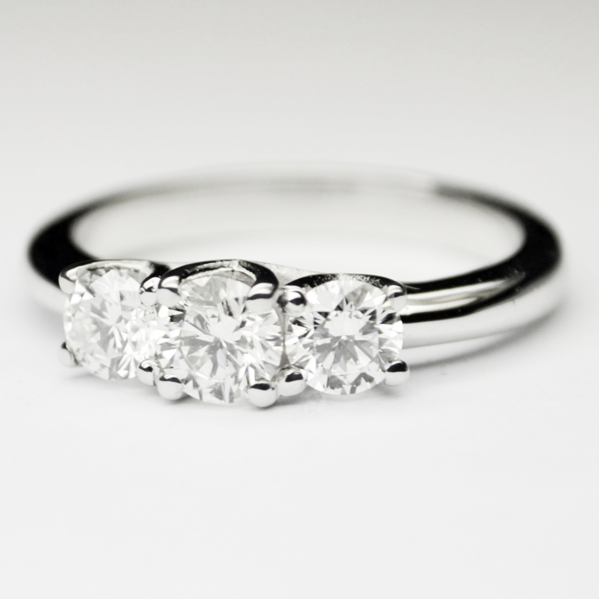 Trilogy in oro bianco 18 karati con 3 diamanti taglio brillante colore F purezza IF (E’ la purezza massima) i 3 diamanti hanno una caratura totale di 0,85 carati (Diamante centrale di 0,35 carati e i laterali di 0,25 carati l’uno)