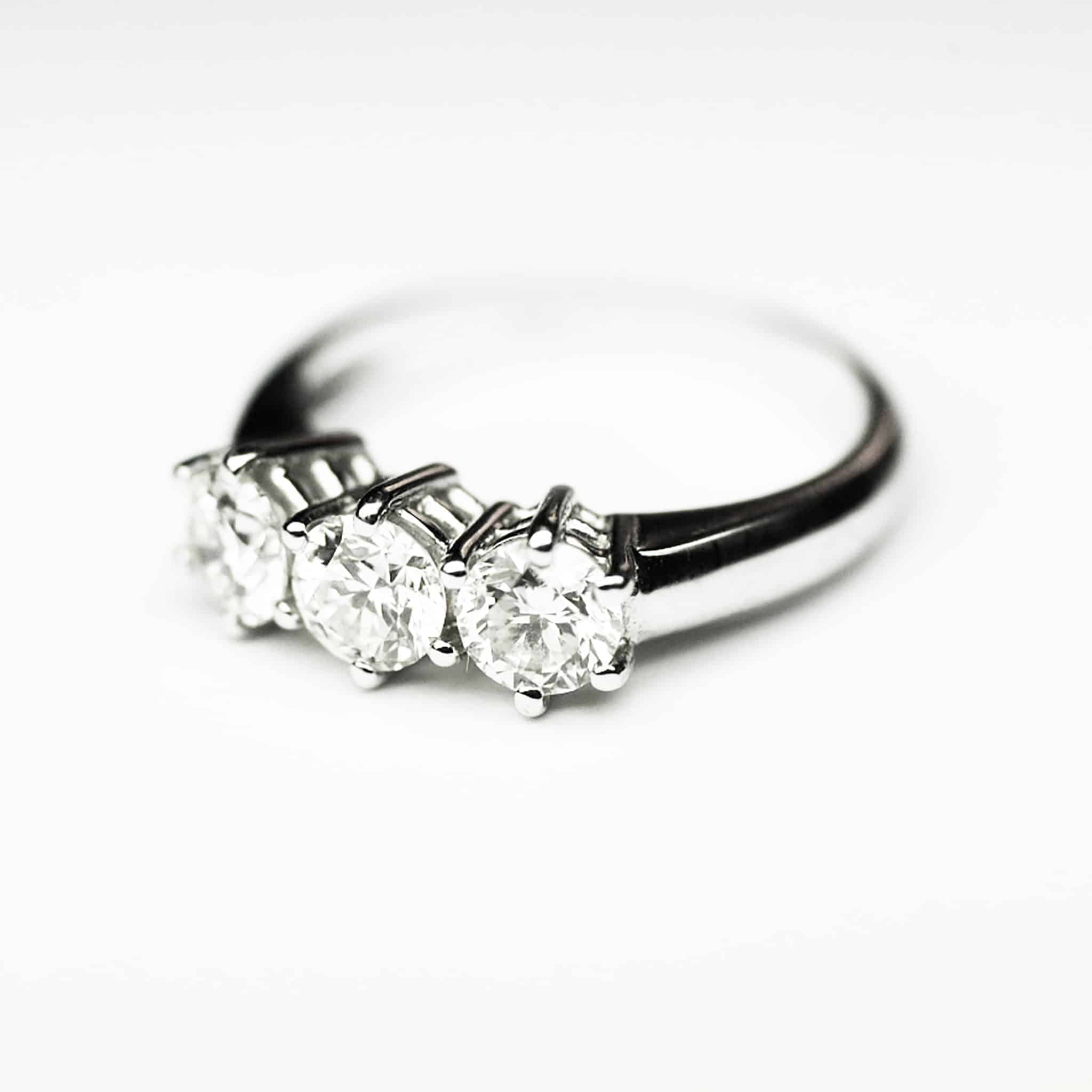 Anello Trilogy con 1 carato totale di diamanti colore G purezza VVS1. Struttura classica in Oro bianco 18 karati – Oro 750.