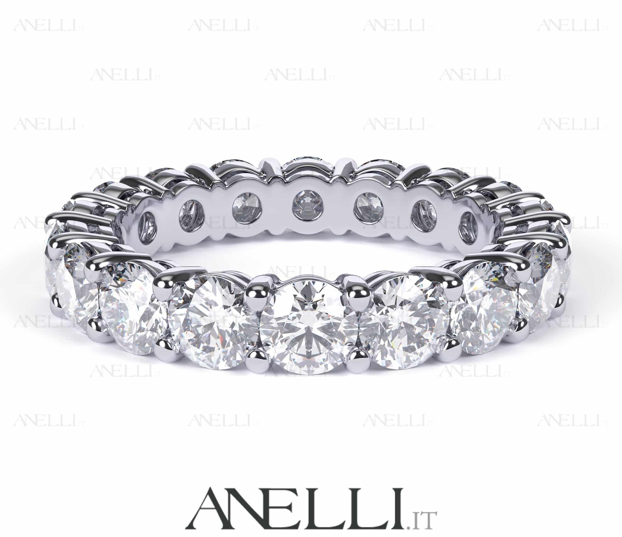 I diamanti di questo anello Eternity a giro hanno fluorescenza nulla (la migliore per il diamante, basta avere una fluorescenza leggermente “sbagliata” per avere un valore di mercato nettamente inferiore e una bellezza decisamente compromessa..)