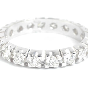 Cominciamo la scheda di questa stupenda fedina a giro scusandoci per le fotografie sfocate, purtroppo il giorno in cui è stata completata la macchina fotografica non ne ha voluto sapere, e ci siamo dovuti arrendere a delle immagini mediocri, ad ogni modo quelle della struttura in fase di lavorazione sono venute benissimo, basteranno per dare un’idea migliore della ripartizione tra diamanti taglio baguette e diamanti taglio brillante.