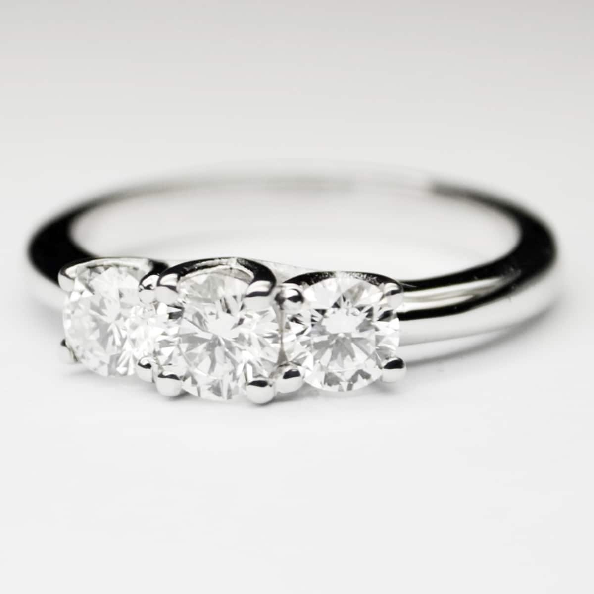Trilogy in oro bianco 18 karati con 3 diamanti taglio brillante colore D purezza IF (E’ il colore e la purezza massima) i 3 diamanti hanno una caratura totale di 1 carato (Diamante centrale di 0,40 carati e i laterali di 0,30 carati l’uno)ย
