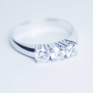 Anello Trilogy con 1 carato totale di diamanti colore G purezza VVS1. Struttura classica in Oro bianco 18 karati – Oro 750.