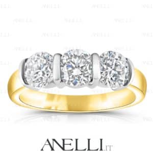 Anello con elegante struttura a binario in oro giallo e oro bianco 18 karati (oro 750) dove sono incastonati tre bellissimi diamanti taglio brillante Excellent da 0.80 carati l’uno (caratura totale di 2.40 Carati)